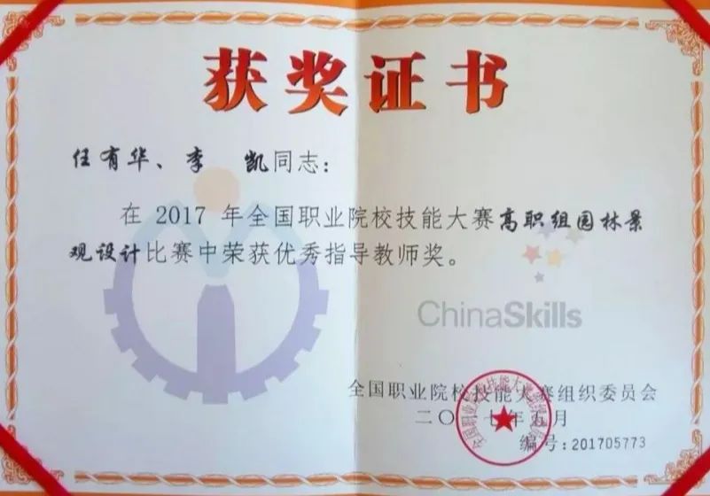 2017年全国职业院校技能大赛“园林景观设计”赛项一等奖;