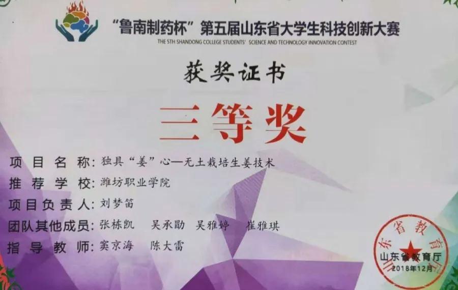 “鲁南制药杯”第五届山东省大学生科技创新大赛三等奖