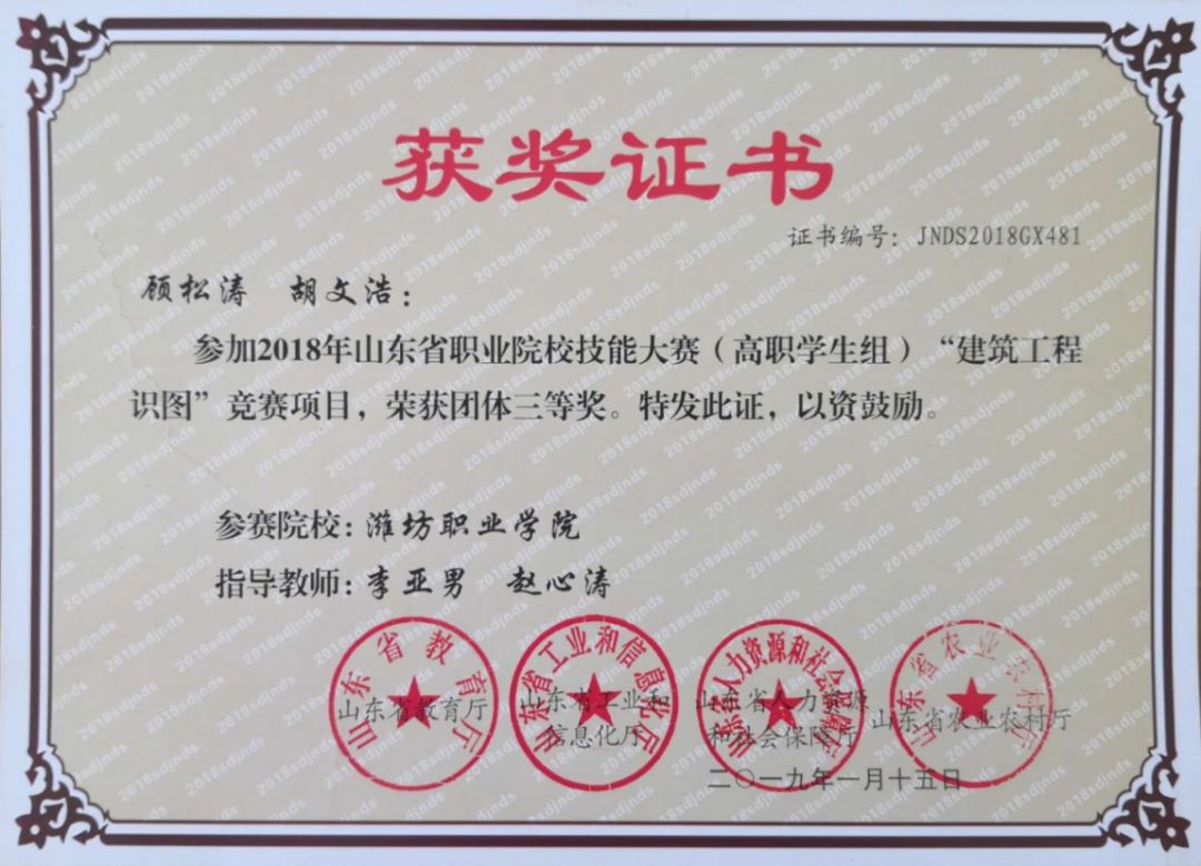 2017、2018年山东省职业院校技能大赛“建筑工程识图”赛项三等奖