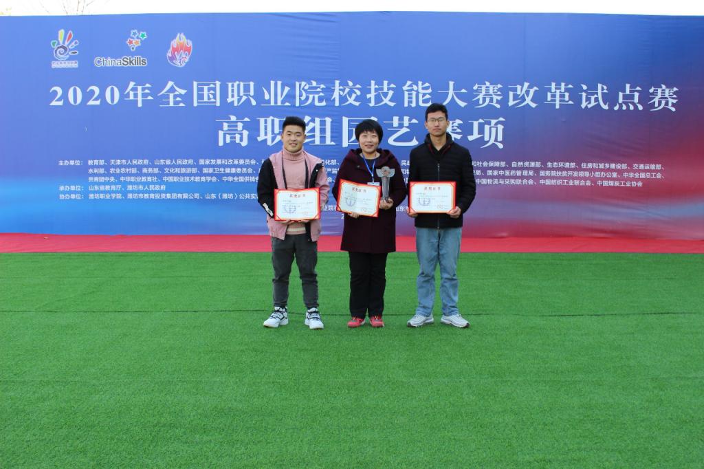 11月10日,2020年全国职业院校技能大赛改革试点赛(高职组)园艺赛项在潍坊职业学院隆重闭幕,由我院张宣、陈计宇2名学生组成的代表队,在本次赛项中取得了一等奖第一名的好成绩,孙曰波、管虹老师荣获大赛“优秀指导教师”奖。