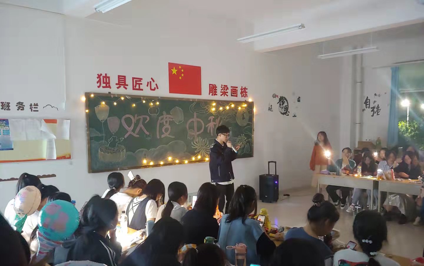 本次活动主要以班级为单位,各班级围绕主题设计方案,在各自教室开展活动。打扫教室、布置桌椅、制作板报,筹备节目,同学们忙得不亦乐乎。晚会中,有班级通过诵读中华经典,讲解中秋节的来历、传统习俗,感受中国传统节日所蕴含的深厚文化内涵;有班级同学们各显才艺,载歌载舞,营造出了浓厚的民族节日氛围;教师们也在晚会上一展歌喉,同学们围坐成一圈打开手电筒轻声合唱,还有学长学姐们表演唱歌跳舞节目为新生晚会助阵。晚会期间,各班级分发印有校徽的月饼,品月饼赏圆月,学生们脸上洋溢着幸福的笑容。整个活动师生同堂欢庆,歌声、乐声、欢笑声充斥着整个校园,使得今年的中秋佳节为潍职校园增添了别具一格的温馨氛围。