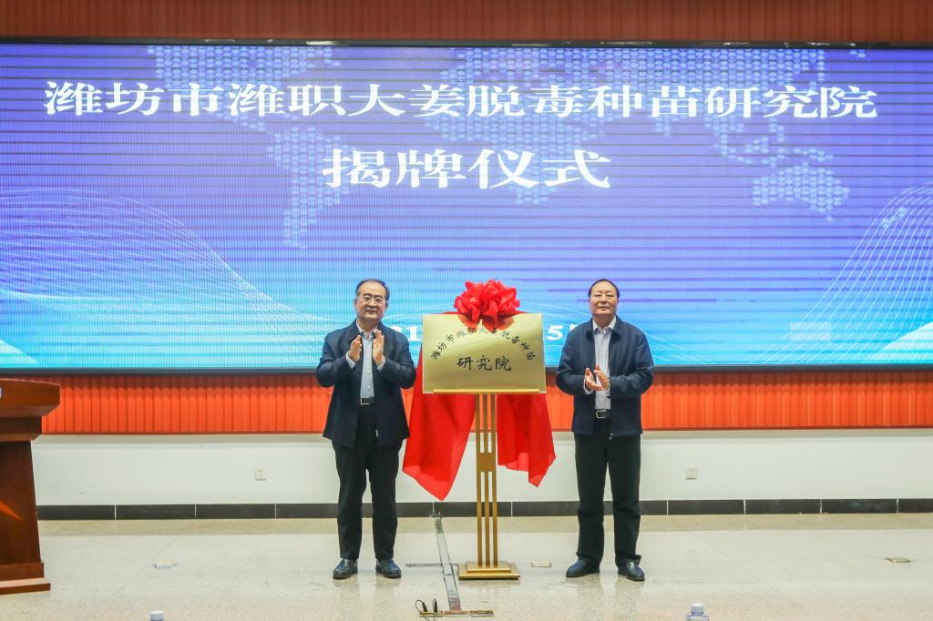 10月15日,潍坊市潍职大姜脱毒种苗研究院揭牌仪式在我院滨海校区明德讲堂举行。省农业农村厅党组成员、副厅长褚瑞云,潍坊市政府党组副书记、副市长马清民共同为潍坊市潍职大姜脱毒种苗研究院揭牌。