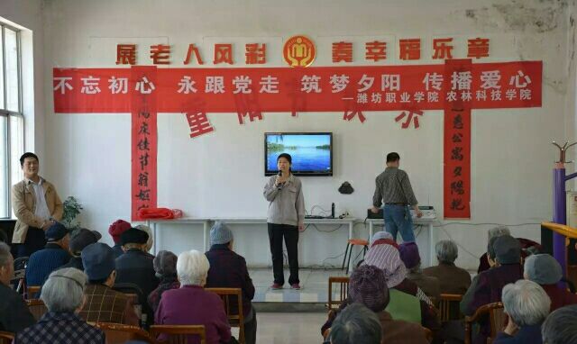 到达老年公寓之后同学们积极帮助工作人员打扫卫生,并且将我们带去的慰问品送给老人们。老年公寓的负责人向大家介绍敬老院的情况以及向老人们说明我们此次来访的目的,并且对我们的到来表示热烈欢迎!部分同学给老人们演唱了歌曲,老人们像是在听自己的孙子孙女在唱歌一样,眼里充满了慈爱。最后由团总支老师代表参与活动的全体成员向老人们表示了深切慰问。