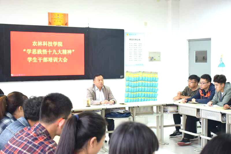 为学深悟透践行党的十九大精神,提高学生干部综合素质,促进学团工作稳步前进,11月7日下午,农林科技学院党支部组织召开“学思践悟十九大精神”学生干部培训大会。学院党支部主要负责同志主持,学生会主席团成员、督导组成员、学生会各部正副部长参加了集中培训。