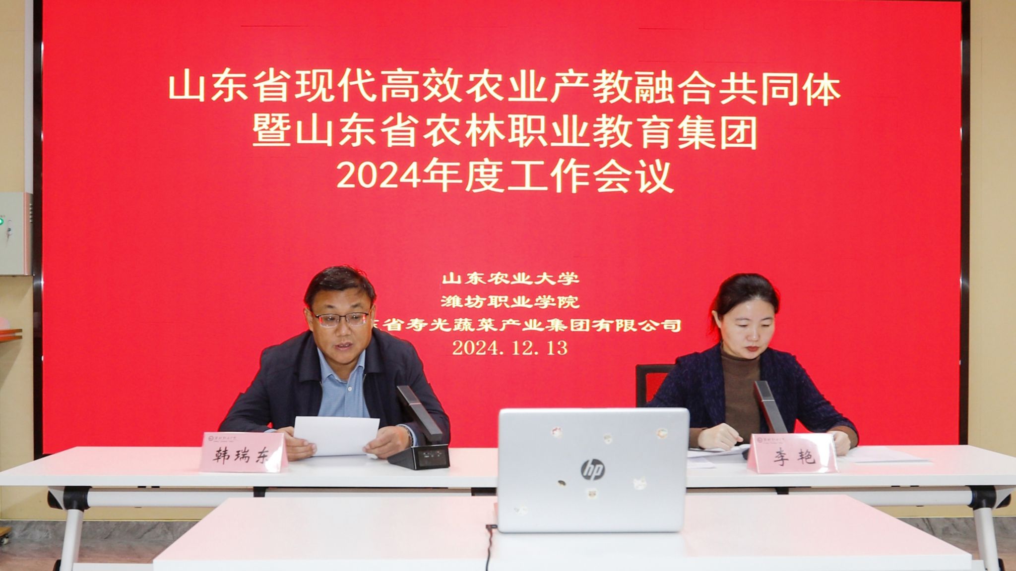 12月13日, 2024年度山东省现代高效农业产教融合共同体暨山东省农林职业教育集团工作会议在潍坊职业学院滨海校区召开,分会场采取线上形式参与会议。潍坊职业学院党委副书记韩瑞东,山东农业大学社会合作与成果转化处处长王永军,山东省寿光蔬菜产业集团有限公司董事长马晓梅,山东省现代高效农业产教融合共同体和山东省农林职业教育集团副理事长单位及成员单位代表,潍坊职业学院科技处(产学研合作中心)、农林科技学院负责同志及全体教师共计50余人参加会议。