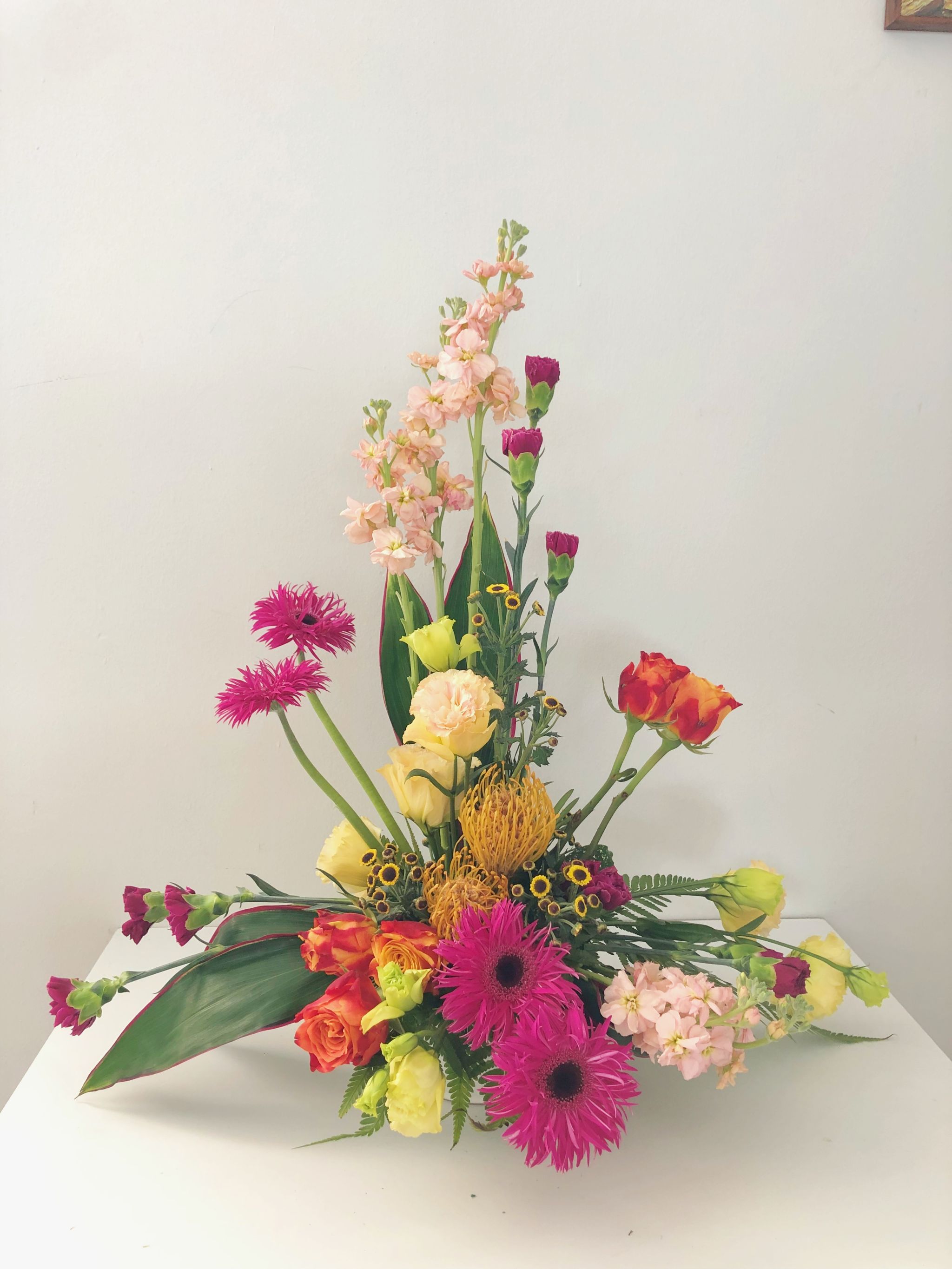 本次活动设置20个展示工位,艺术插花研习社成员自愿报名参与,指导教师安排插花展位。参与作品插作的社团成员自行采购花材,提前与指导教师沟通交流修改作品设计图样,现场完成作品插作。作品完成后,面向全院师生展出,现场有指导教师导引讲解。插作完成后,在花艺室面向全院师生开展传统插花艺术讲座,讲座期间举行了示范插花交流。