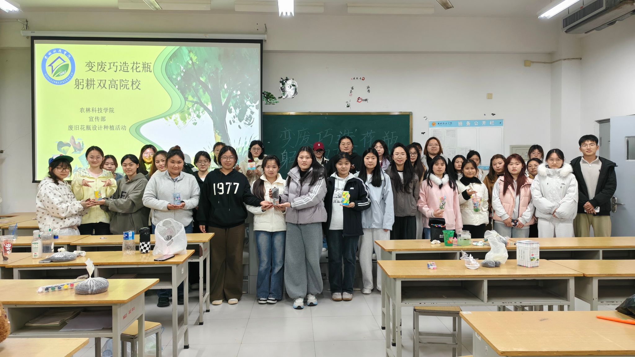 制作过程中,学子们以废旧大瓶为载体,精心设计造型、打磨细节,将环保理念与匠心创意融入每一处制作环节。最终,所有队伍均顺利完成花瓶制作,作品在环保性、创意性、美观性方面表现突出,无破损、无安全隐患,充分体现了农林学子的创新思维、实践能力与节约环保的良好素养,也为后续植物种植养护环节奠定了坚实基础。(供稿人:李琳琳 许圆梦)