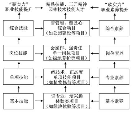 依据园林岗位群职业能力分析,将职业技能“硬实力”分解为基本技能→单项技能→岗位技能→综合技能。