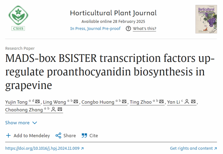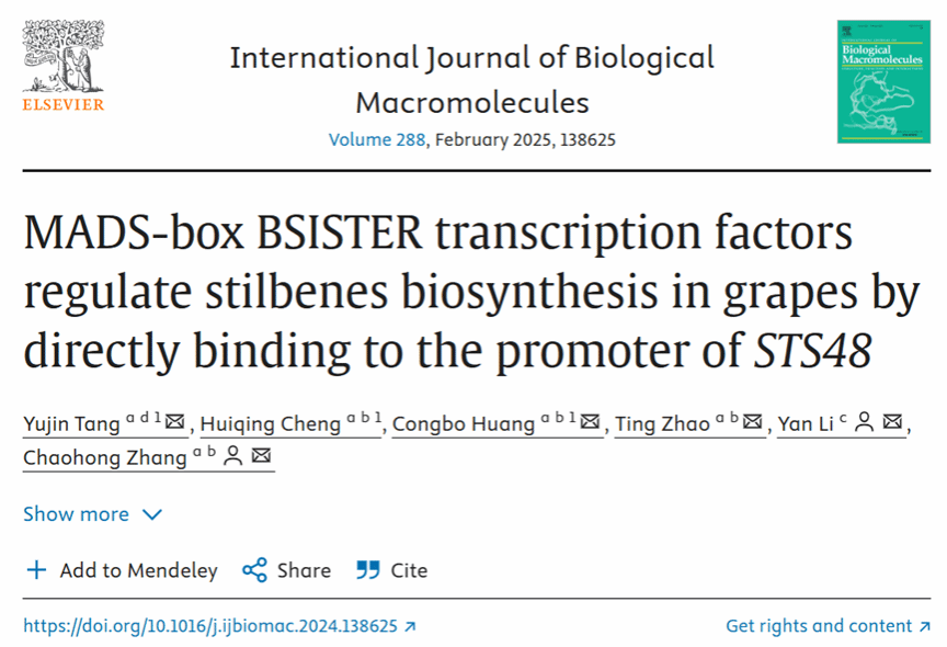近日,农林科技学院唐玉瑾博士与西北农林科技大学合作,在国际权威期刊《International Journal of Biological Macromolecules》和《Horticultural Plant Journal》发表了题为“MADS-box BSISTER transcription factors regulate stilbenes biosynthesis in grapes by directly binding to the promoter of STS48(MADS-box BSISTER转录因子通过直接结合STS48启动子调控葡萄中芪类物质的生物合成)”和“MADS-box BSISTER transcription factors up-regulate proanthocyanidin biosynthesis in grapevine (MADS-box BSISTER转录因子上调葡萄中原花青素的生物合成)”的研究论文,唐玉瑾博士为第一作者。