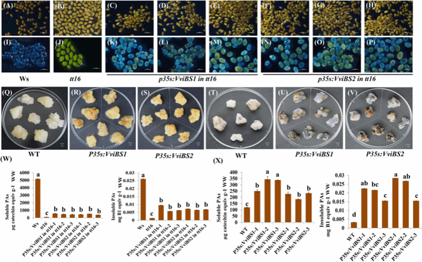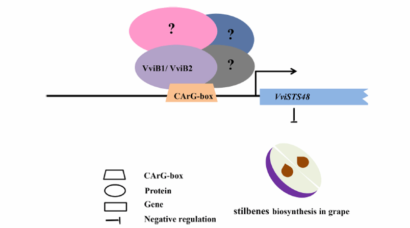 芪类物质和原花青素是植物中重要的酚类次生代谢物。芪类具有抗氧化、抗炎和抗衰老作用,在葡萄等植物中参与防御反应;原花青素能增强植物抗逆性,并在人体中发挥心血管保护、抗肿瘤和改善微循环等功效,是植物防御和人类健康的关键活性成分。研究在葡萄基因组中鉴定得到3个BS转录因子基因(VviBS1、VviBS2和VviBS3),首次发现VviBS1和VviBS2转录因子可通过下调STS48的基因的表达去调控葡萄中芪类化合物的合成。同时还通过直接促进原花青素合成关键酶基因VviANR和VviLAR的表达促进原花青素合成。