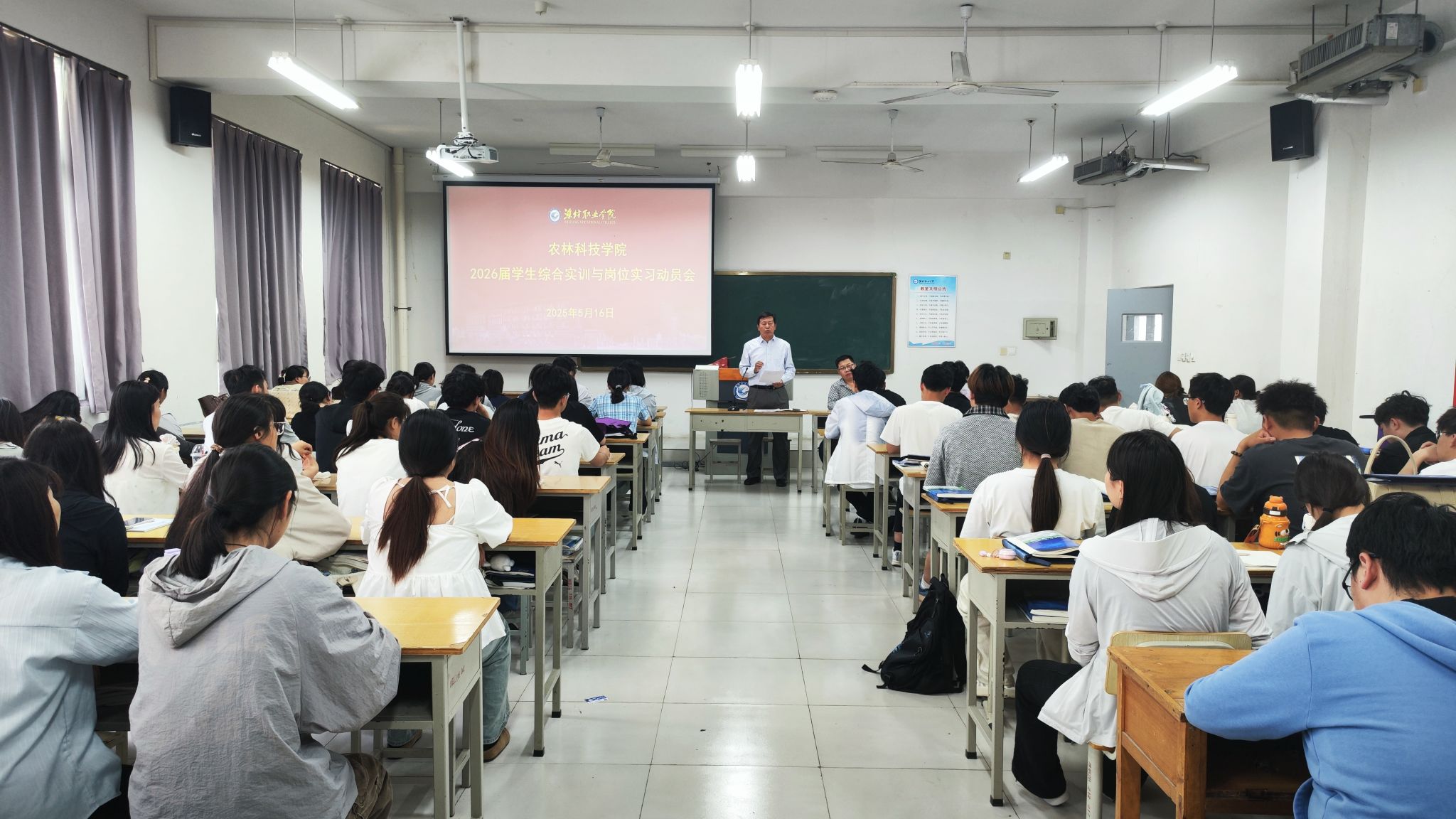 为全面落实人才培养方案要求,扎实做好学生实习实践工作,引导学生明确实习目标、强化职业素养,5月16日,农林科技学院按专业划分设置四个会场,同时召开2026届综合实训与岗位实习动员会。农林科技学院领导、专业负责人、辅导员及2026届学生600余人参会。