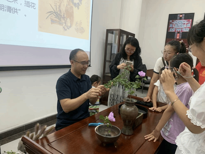 张二海老师主持了这次插花活动。张老师以通俗生动的讲解,拆解插花背后的美学逻辑。轻松掌握插花技巧,从花材甄选、色彩搭配到造型设计,一步步解锁美学密码。此次花艺活动有50余人参加,张老师在讲解示范完成后,大家都亲手插作体验,与中国传统插花艺术做了一次近距离的接触。